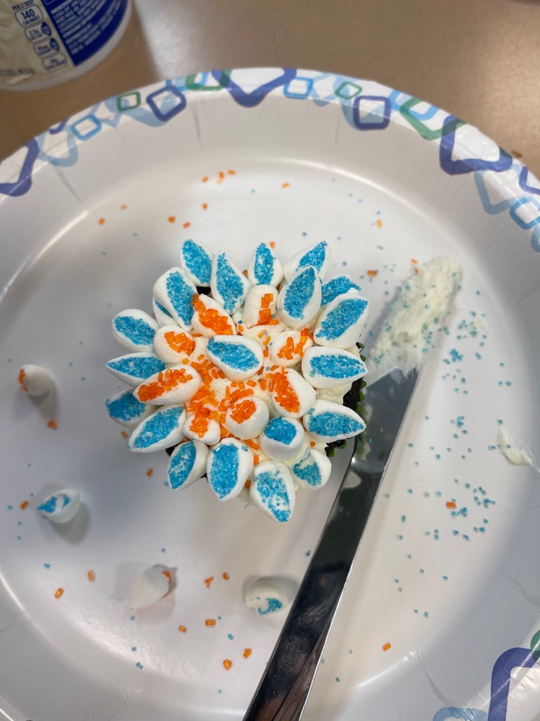 Yesterday in baking club we enjoyed cupcake decorating! Using sprinkles, marshmallows, frosting, and cupcakes, we made fun flower designs. These were so easy to make and we will definitely be baking them again in the future! Recipe below!