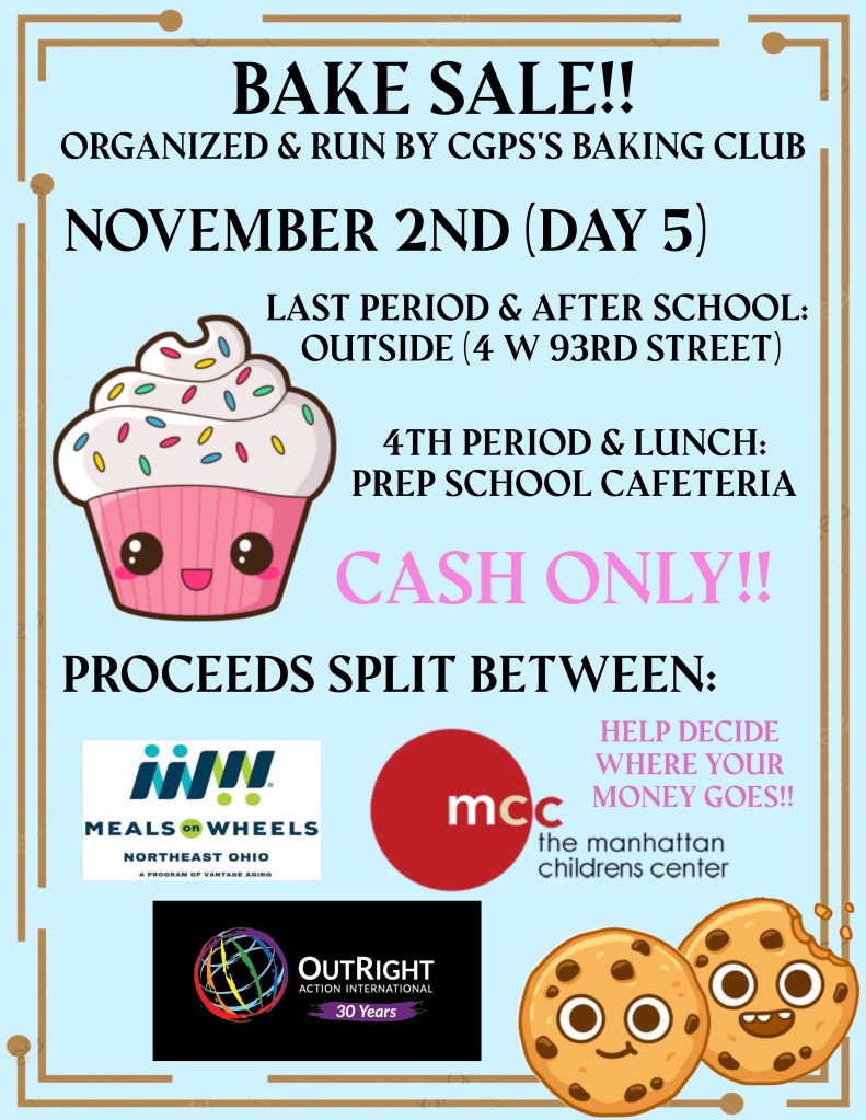 On November 2nd, baking club had its first bake sale! We baked and sold a variety of desserts to raise money for City Meals on Wheels, Manhattan Children’s Center, and Outright Action International. It was a great learning experience, as we would able to see what sold best, what had good profit margins, and what we could improve for next time! Everyone had lots of fun baking and running the bake sale for a good cause, and we look forward to many future bake sales!